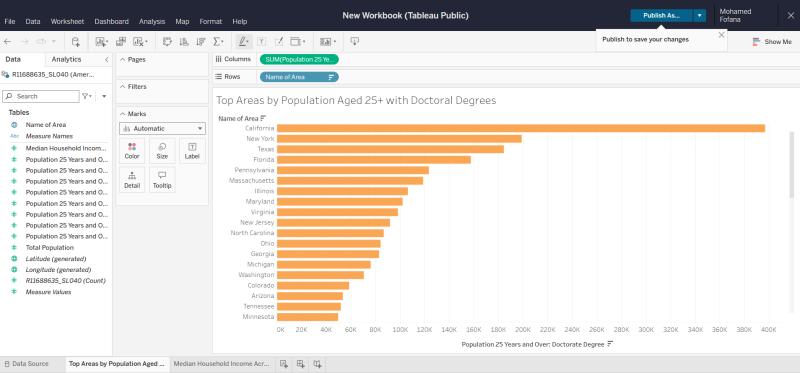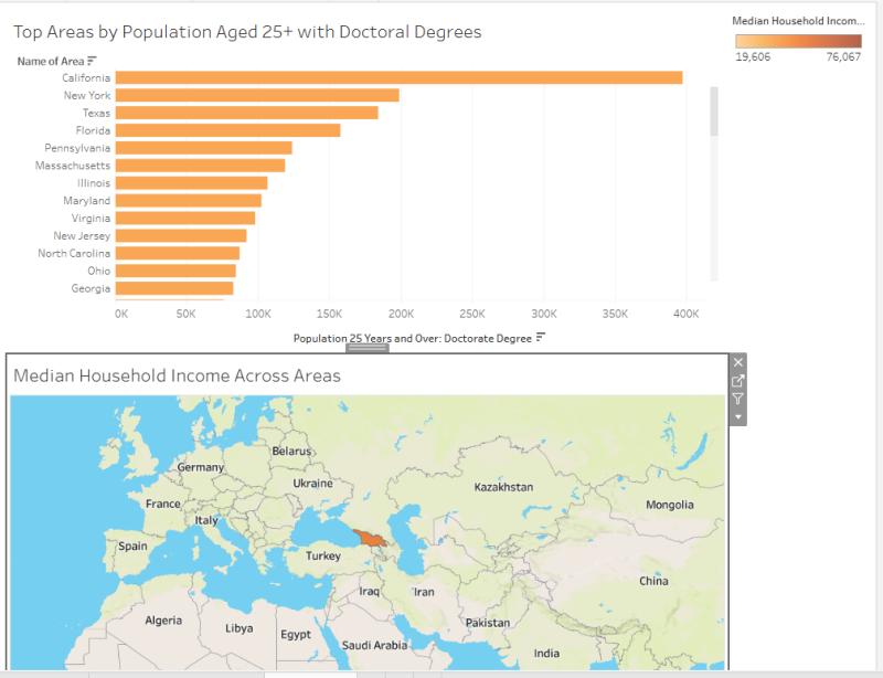 Designed a bar chart showcasing top areas by population aged 25+ with doctoral degrees.